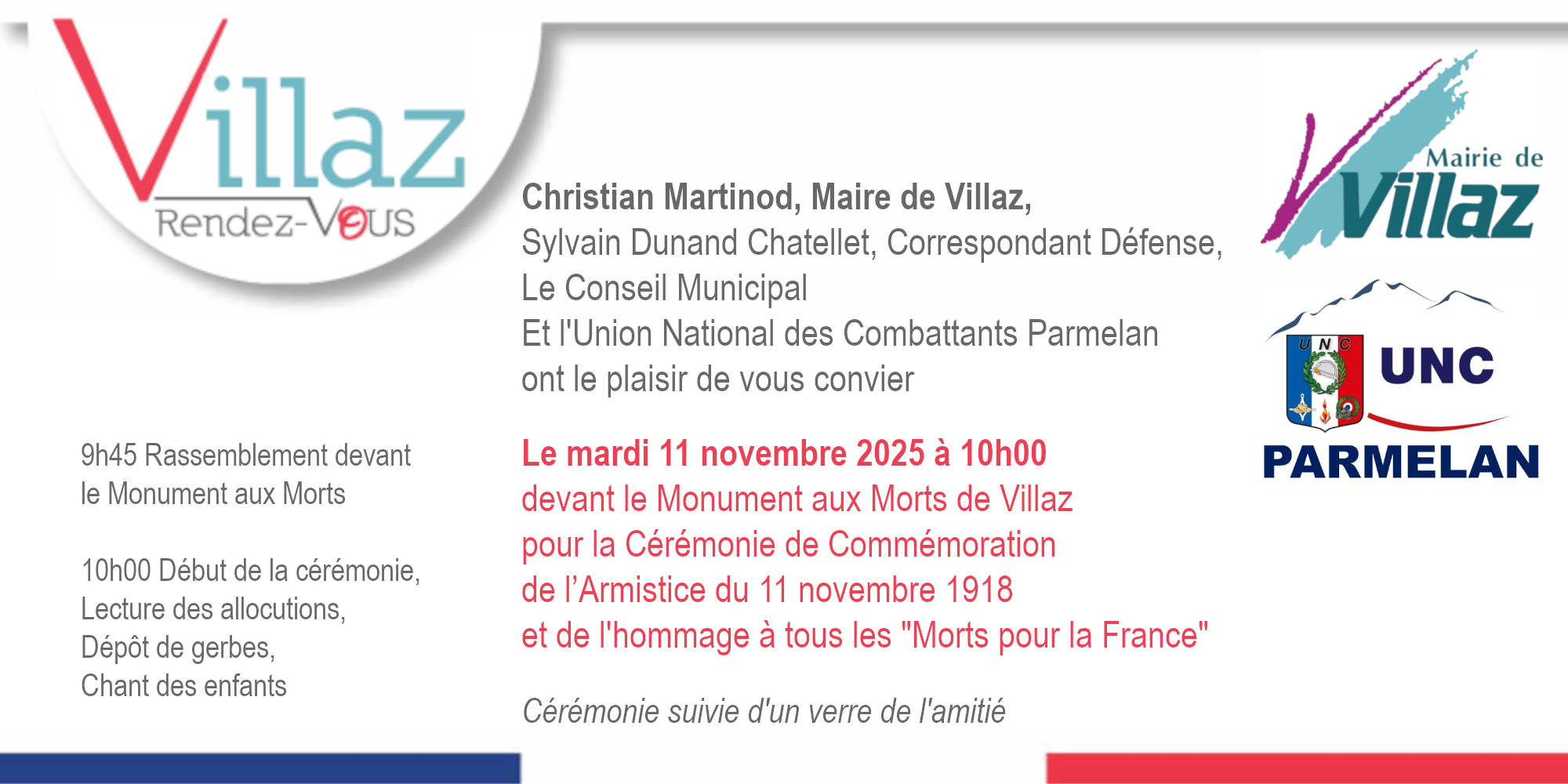 Le mardi 11 novembre 2025 à 10h, devant le Monument aux Morts de Villaz, pour la Cérémonie de Commémoration de l’Armistice du 11 novembre 1918 et de l’hommage à tous les « Morts pour la France ».