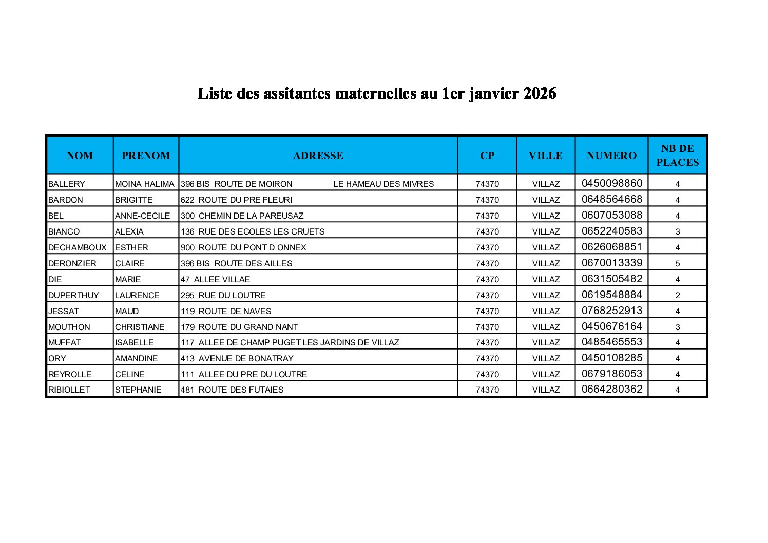 Téléchargez la liste des assistantes maternelles domiciliées sur la commune, en activité au 01 janvier 2026.