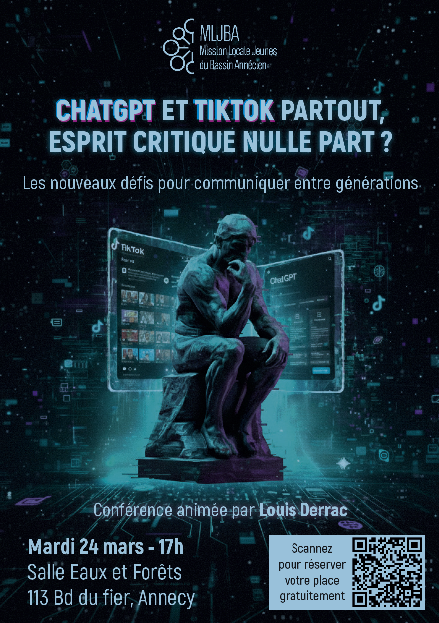 La Mission Locale Jeunes du Bassin Annécien a le plaisir de vous inviter à une conférence inédite, animée par Louis DERRAC, sur le thème : ChatGPT et TikTok partout, esprit critique nulle part ? Les nouveaux défis pour communiquer entre générations !
