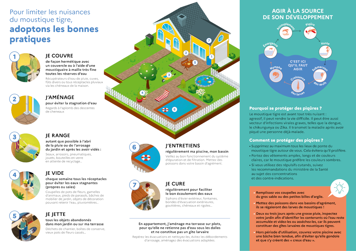 Retrouvez également ci-dessous (et en téléchargement LA) une plaquette d’information sur le moustique tigre et les bonnes pratiques à adopter :